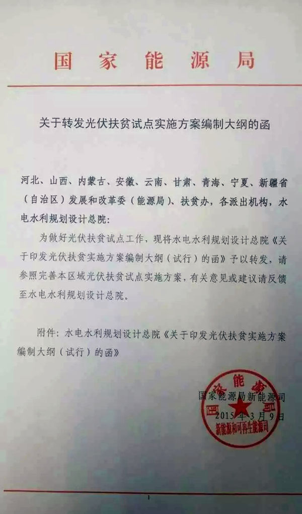 圖為:國家能源局關于轉發光伏扶貧試點實施方案編制大綱的函
