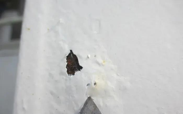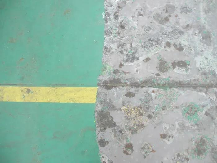 在海上維修時,設計涂料能夠選擇耐氣候變化的涂料(即天氣變化非常頻繁,要適應變化)。圖片中涂料在噴涂完成后下雨,在積水區域出現白斑,沒有處理,直接噴下道涂層,附著力并未受到影響。
