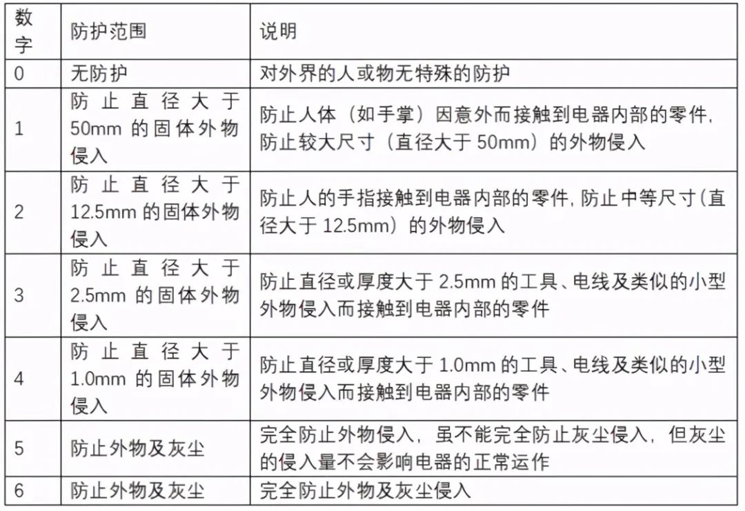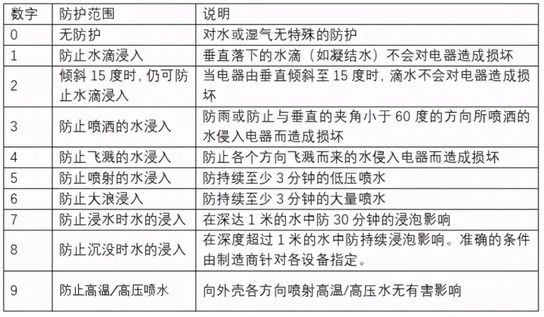 第一位數字表示防塵等級、防止外物侵入的等級(外物指含工具,人的手指等均不可接觸到電器之內帶電部分),由0-6劃分為7個等級;第二位數字表明設備防水的程度。代表防止進水的等級,最高級別是9。