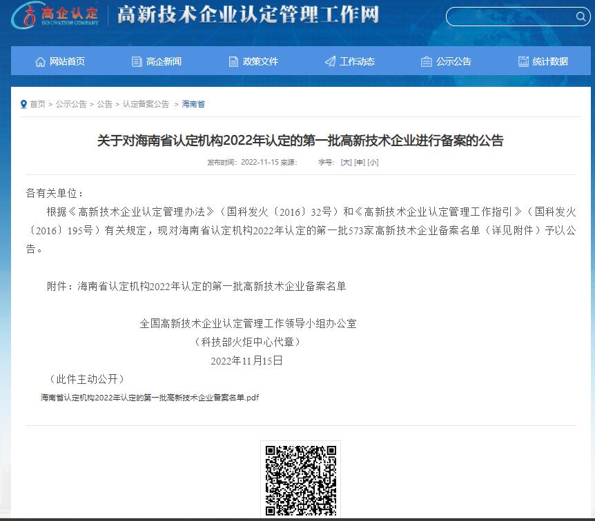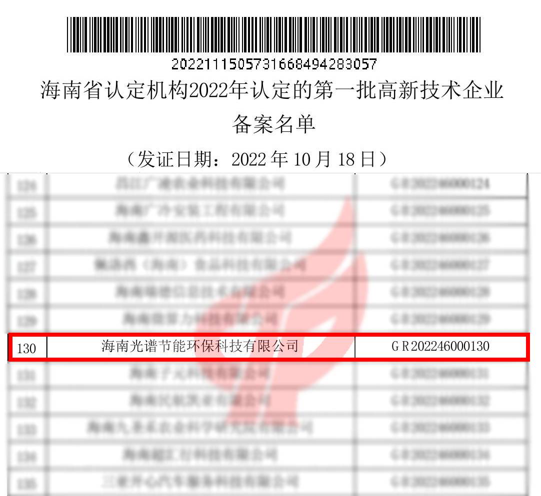 2022年11月15日,全國高新技術(shù)企業(yè)認(rèn)定管理工作領(lǐng)導(dǎo)小組辦公室發(fā)布《關(guān)于對海南省認(rèn)定機(jī)構(gòu)2022年認(rèn)定的第一批高新技術(shù)企業(yè)進(jìn)行備案的公告》,海南光譜節(jié)能環(huán)保科技有限公司憑借過硬的研發(fā)實(shí)力和創(chuàng)新能力,成功通過本次認(rèn)定。