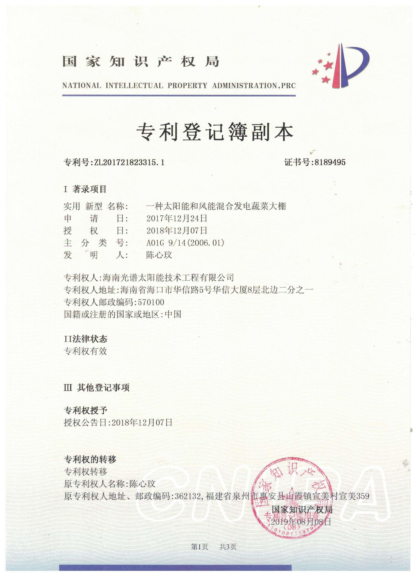 實(shí)用新型專利 一種太陽能和風(fēng)能混合發(fā)電蔬菜大棚